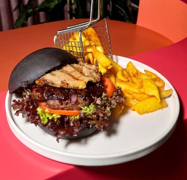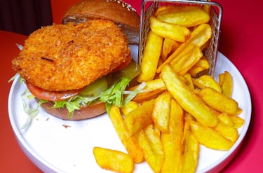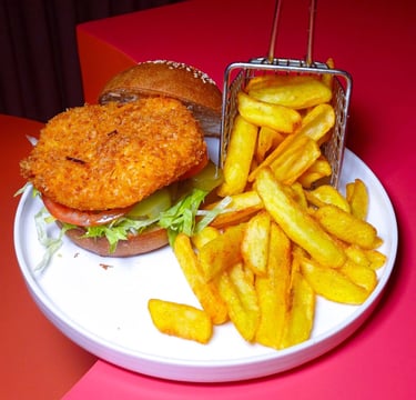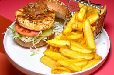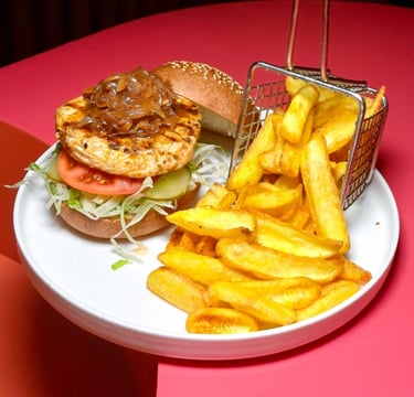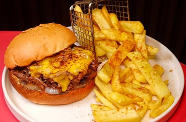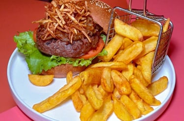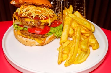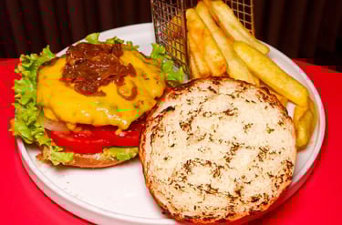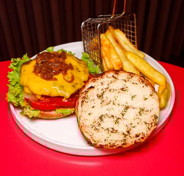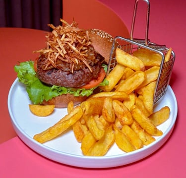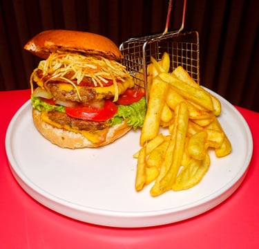 180 gr Dana köfte, Marul, Domates, Turşu, Cheddar peyniri, Karamelize soğan, Kaşık patates