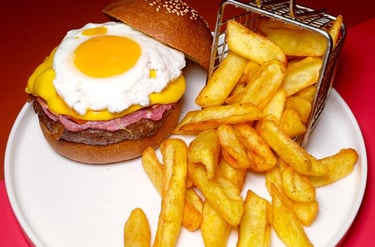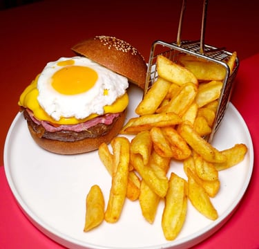 180 gr dana köfte, dana bacon, karamelize soğan, poşe yumurta, cheddar sos ve yanında kaşık patates