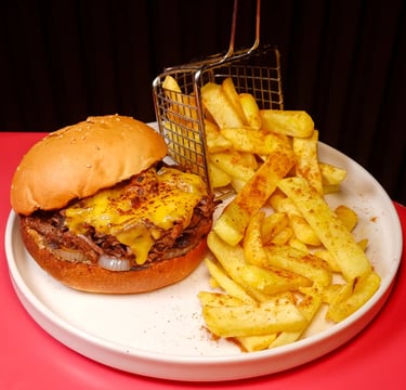 360 gr Dana köfte, Marul, Domates, Turşu, Cheddar peyniri, Karamelize soğan, Kibrit patates, Kaşık patates