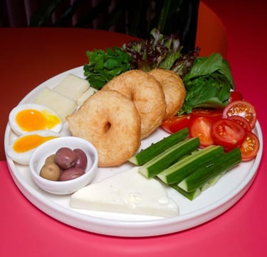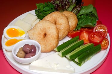Pişi, haşlanmış yumurta, Ezine peyniri, Bergama tulum peyniri, zeytin, taze yeşillikler, domates, salatalık, çilek reçeli