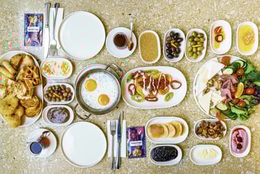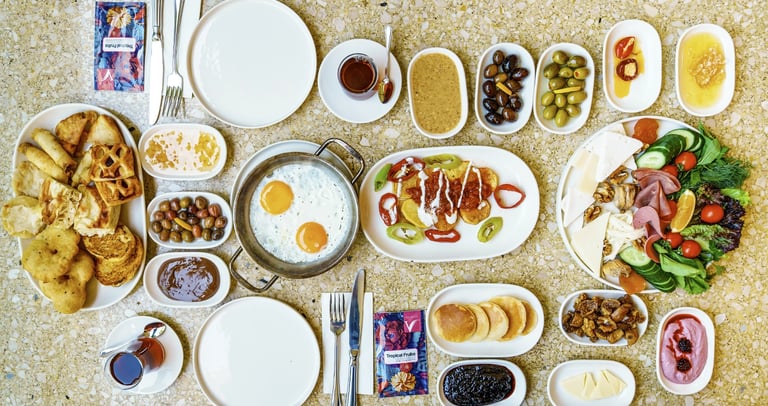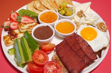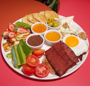 Pankek, göz yumurta, sucuk, hellim, zeytin, cherry domates, salatalık, taze yeşillik, çeçil peyniri, kaşar peyniri, bal, Nutella, portakal reçeli, çilek, kivi, ceviz