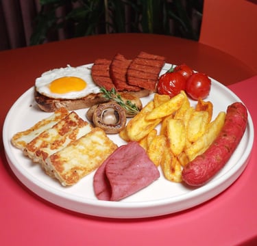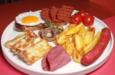 Kızarmış ekmek, göz yumurta, ızgara sosis, ızgara jambon, ızgara hellim, ızgara mantar, ızgara domates, baharatlı patates tava