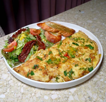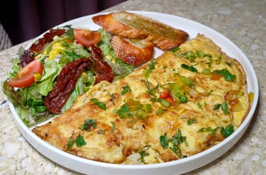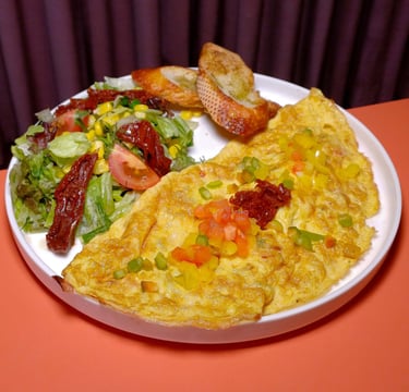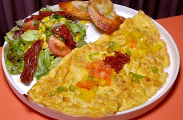 Domates, Biber, Kaşar peyniri, Yumurta, Akdeniz yeşilliği, Parmesanlı ekmek