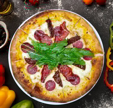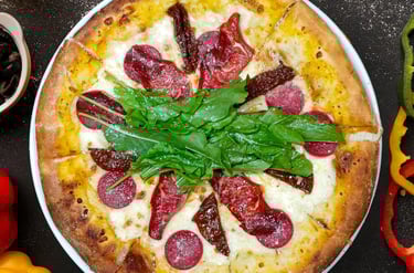 Pizza sosu, mozzarella, çemensiz pastırma, sucuk, kurutulmuş domates, tulum peyniri