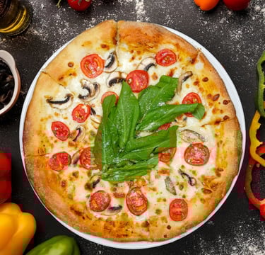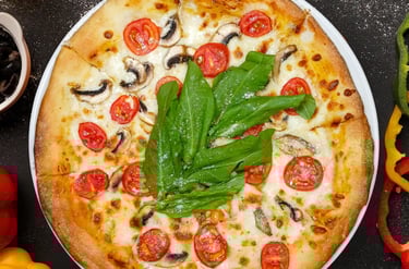 Pizza sosu, mozzarella, Mantar, Domates, Parmesan
