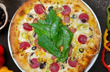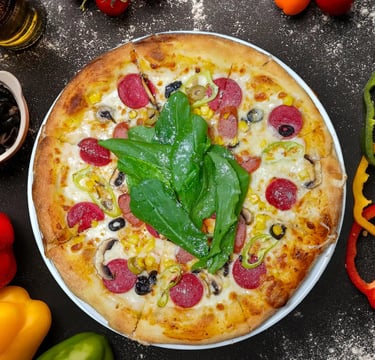 Pizza sosu, mozzarella, sucuk, sosis, mantar, kapya biber, dilim yeşil zeytin, dilimli siyah zeytin, mısır