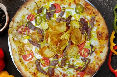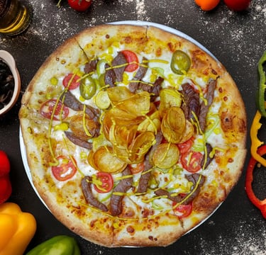 Pizza sosu, mozzarella, jalapeno biberi, kapya biber, bonfile parçaları, mısır, domates, patates cipsi, hardal sos