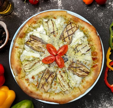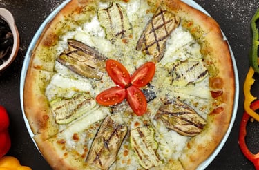 Fesleğen sos, mozzarella, hellim peyniri, ızgara patlıcan, ızgara kabak, cherry domates