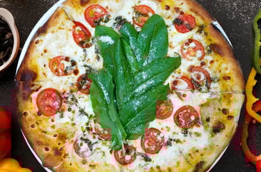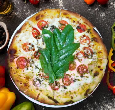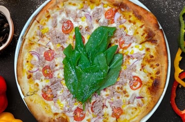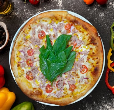 Pizza sosu, mozzarella, Ton balığı, Mor soğan, Cherry domates, Mısır