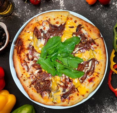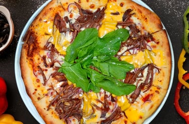 Özel pizza sos, dana tandır, mozzarella, cheddar peynir, kuru soğan, roka